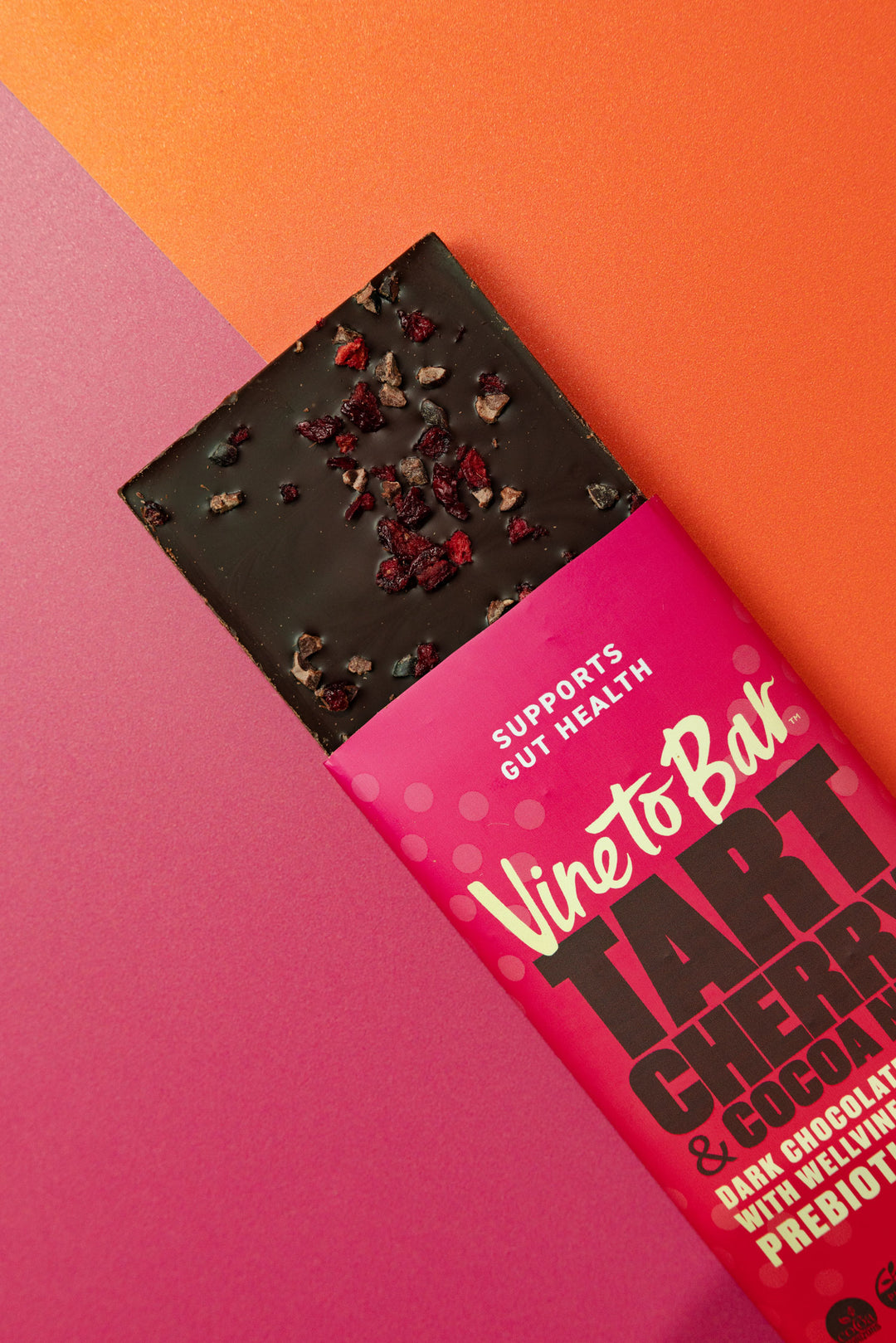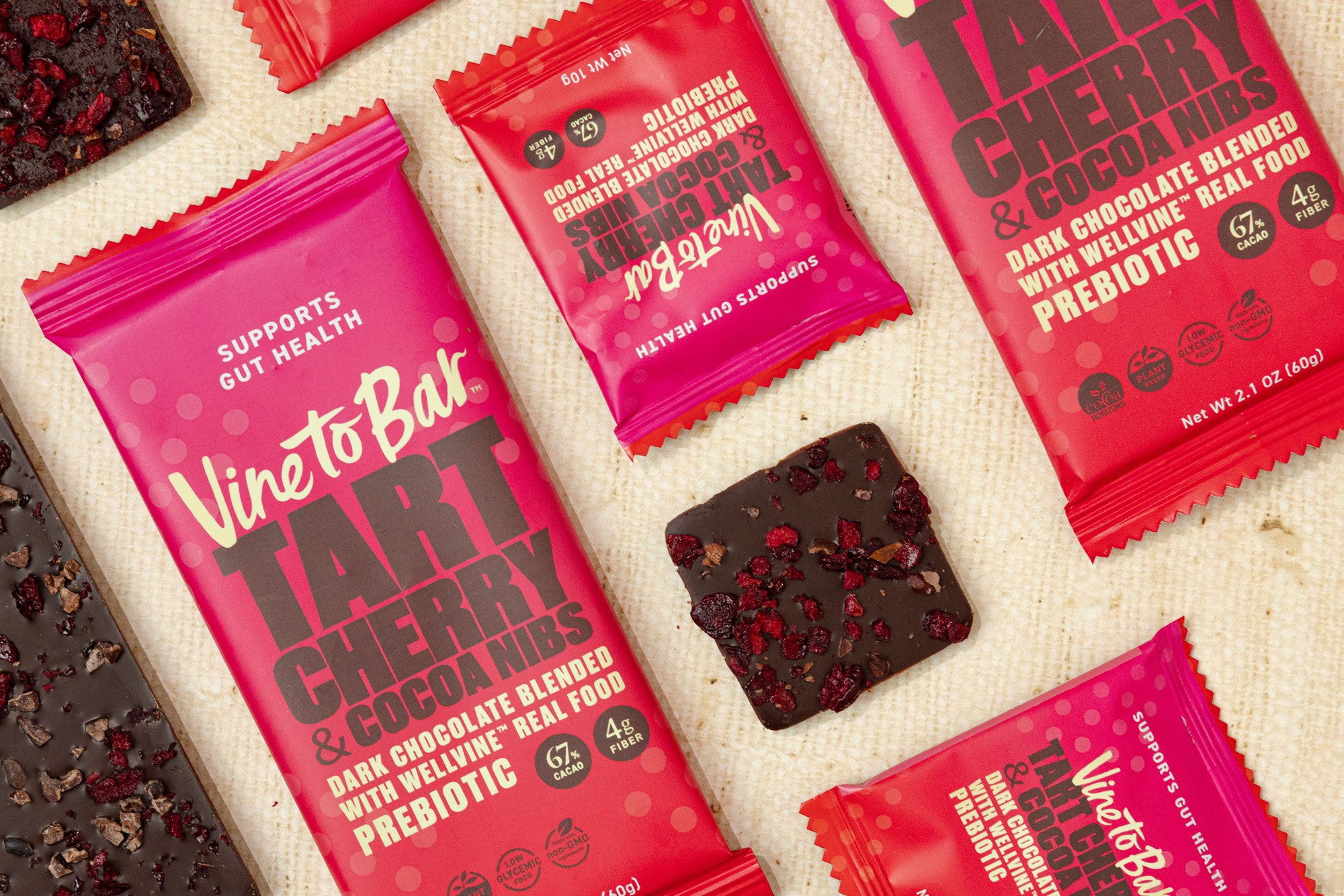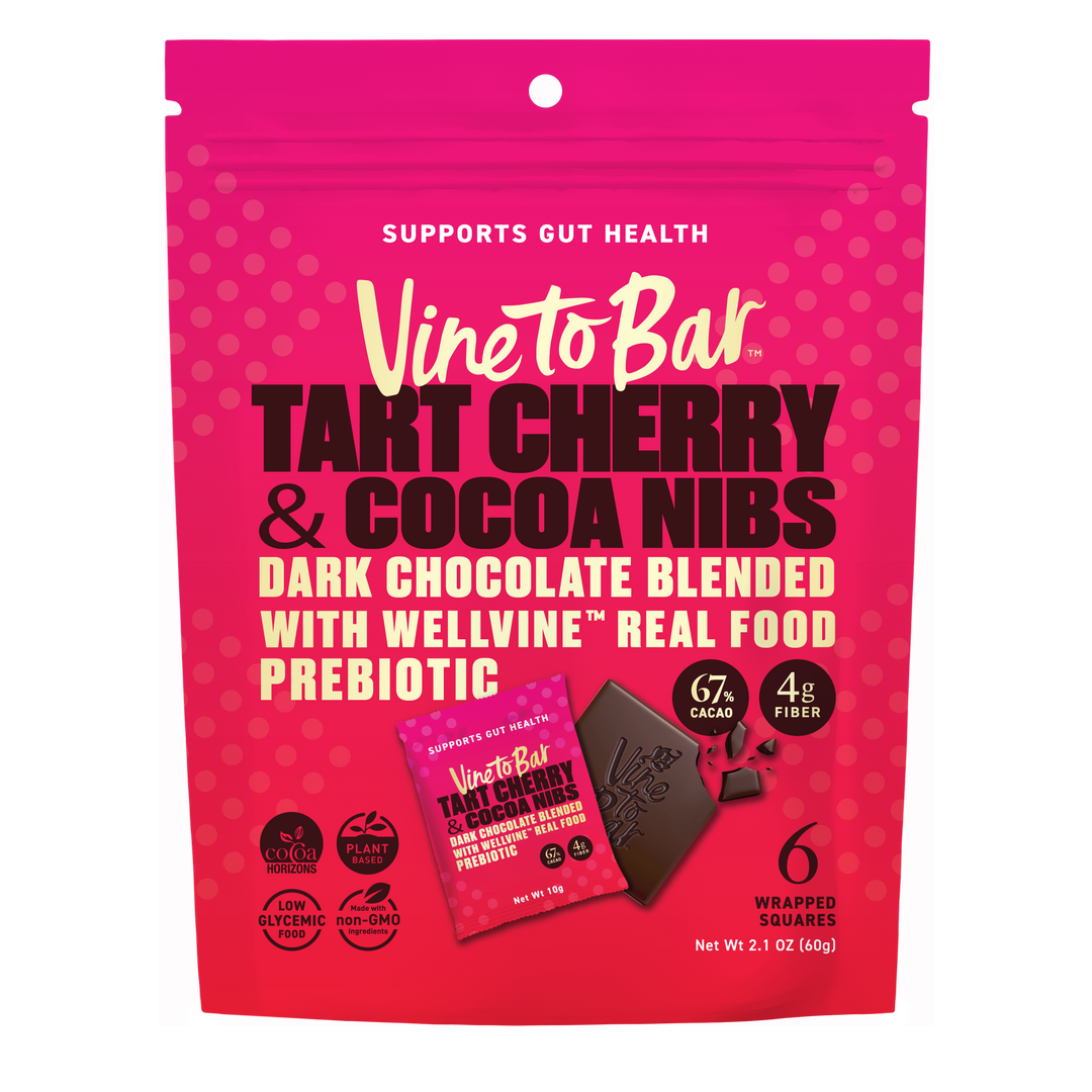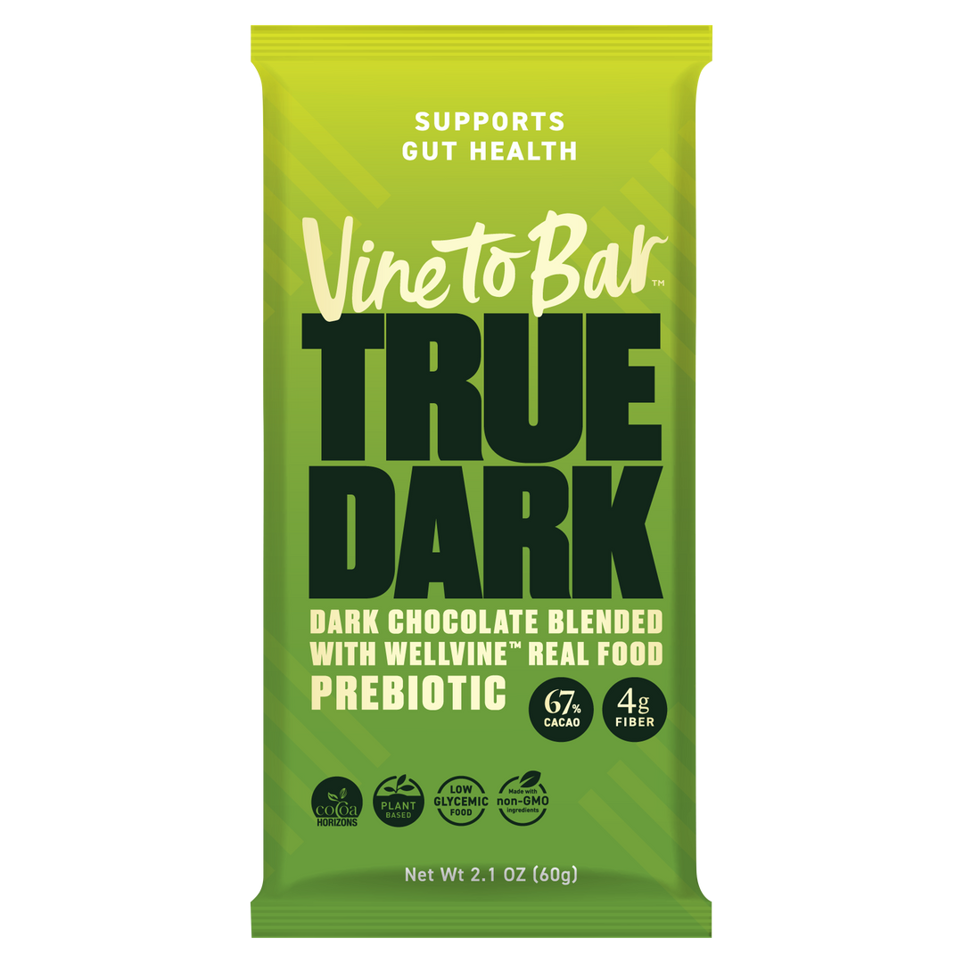 Vine to Bar is rich, premium, 67% dark chocolate blended with freshly pressed, upcycled chardonnay grapes that have been dried and milled, known as WellVine™. Patented to improve the taste and nutritional content of chocolate thanks to its natural sweetness, bright fruit notes, and real food prebiotics, it’s the only chocolate in the world that supports gut health AND your taste buds!